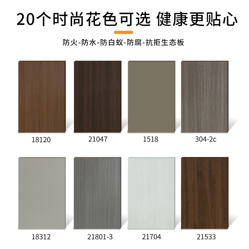生態(tài)板的花色種類繁多,色彩艷麗。免油漆、耐磨、耐高溫、耐腐蝕、防水防潮、握釘力好、環(huán)保、低碳、表面不變色、不剝落,具有許多天然木材無法比擬的優(yōu)良性能不能同時擁有。用它制成的家具無需上漆,表面自然形成一層保護膜,耐磨、耐劃傷、耐酸堿、耐污染、環(huán)保美觀。